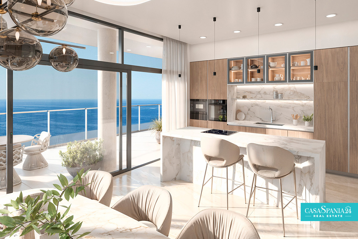 De terrassen van de woningen zijn afgewerkt met glazen balustrades die vanuit het huis een continu uitzicht op zee bieden.