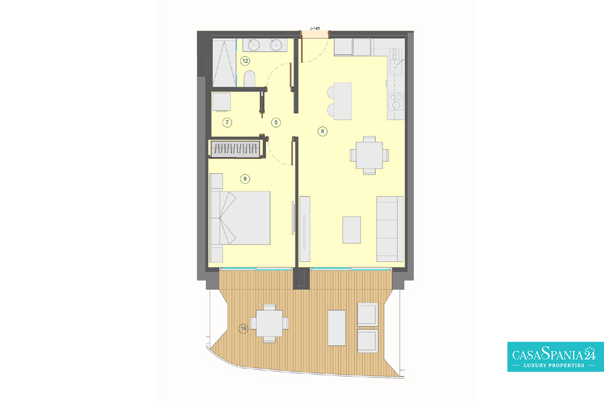 Exclusief appartement met 1 slaapkamer, 1 badkamer, woonkamer met open keuken, parkeerplaats en een ruim terras van 18 m².