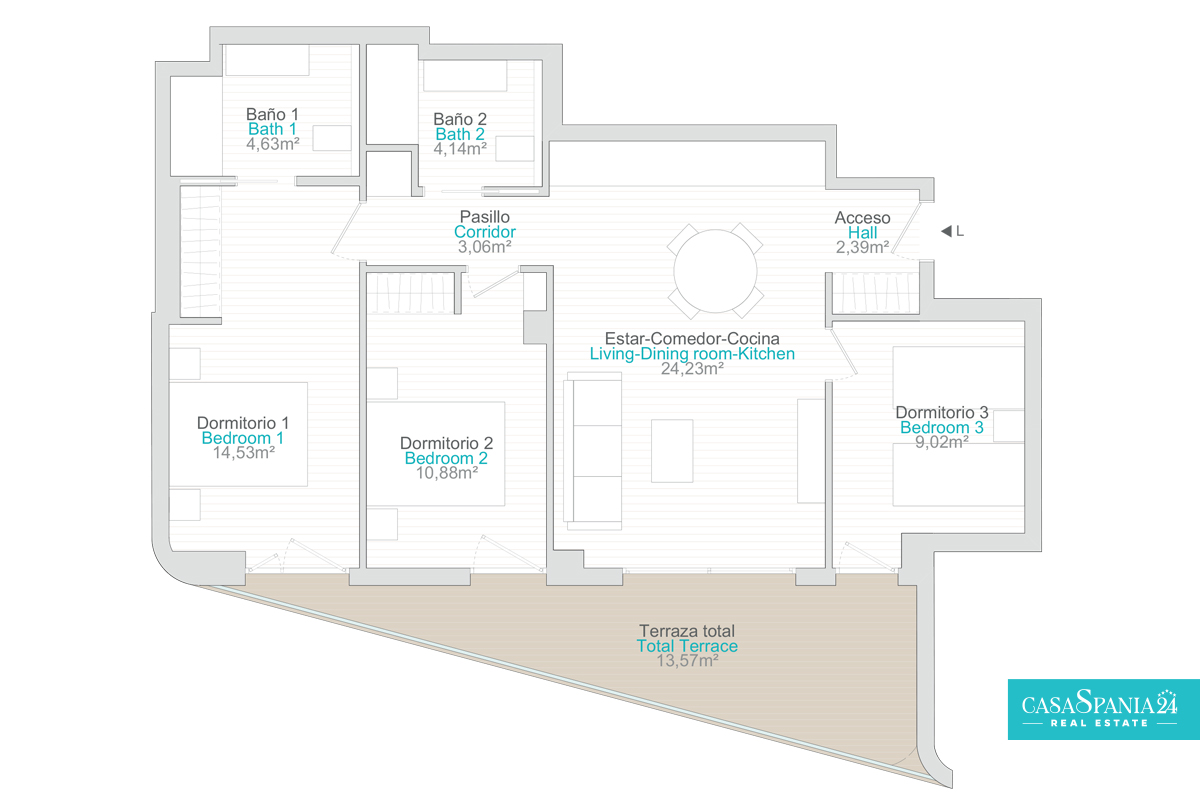 Het appartement met 3 slaapkamers, 2 badkamers, woonkamer met open keuken en een terras van 13 m² is de perfecte keuze voor wie op zoek is naar comfort, elegantie en functionaliteit in een moderne ruimte. Het royale terras biedt een ideale plek om te ontspannen, waar u kunt genieten van het buitenleven en het uitzicht, en vormt een harmonieuze aanvulling op de stedelijke en moderne levensstijl.