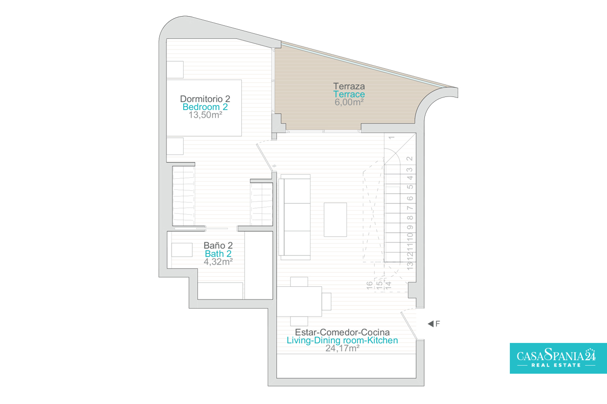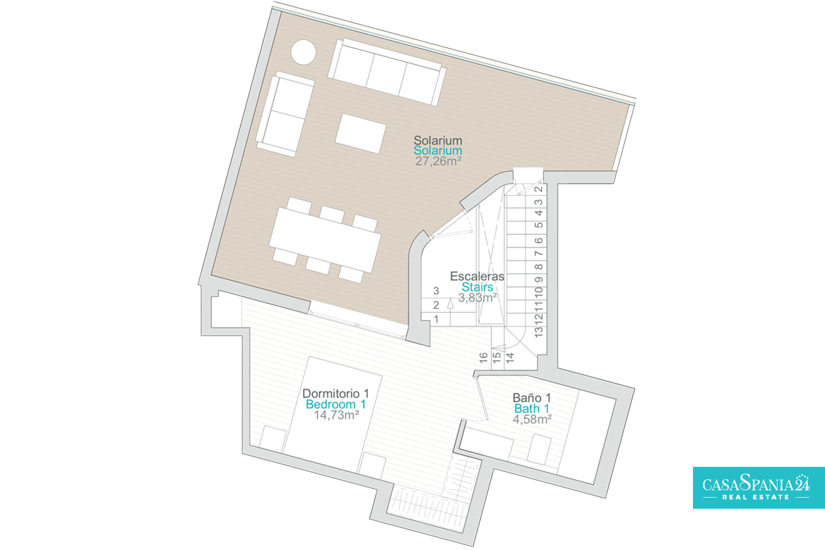 Het penthouse met twee verdiepingen, met 2 slaapkamers, 2 badkamers, een woonkamer met open keuken, een terras van 6 m² en een solarium van 27 m², is de perfecte keuze voor wie op zoek is naar comfort, elegantie en functionaliteit in een moderne ruimte. Het royale terras biedt een ideale plek om te ontspannen, waar u kunt genieten van het buitenleven en het uitzicht, en vormt een harmonieuze aanvulling op de stedelijke en moderne levensstijl.