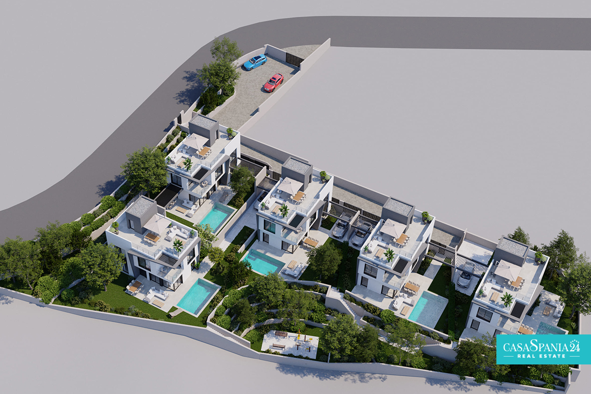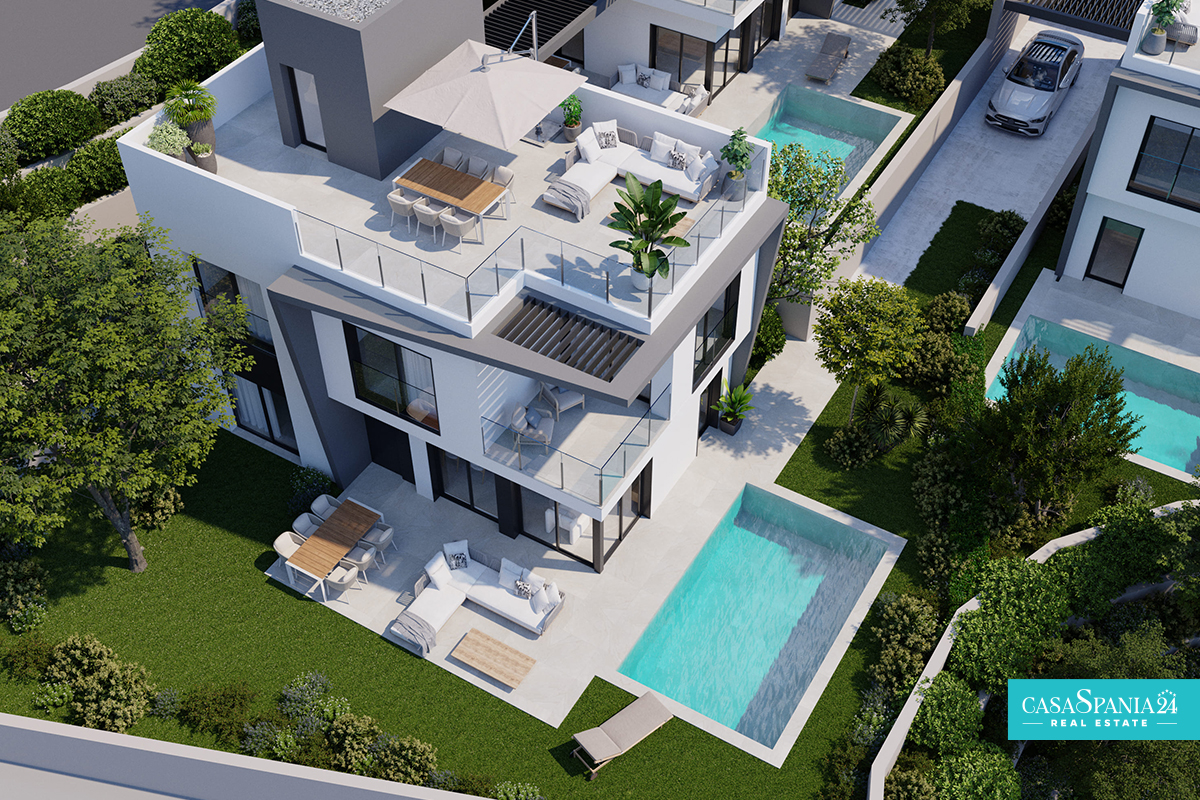 Moderne villa op twee niveaus, bestaande uit 4 slaapkamers, 3 badkamers, woonkamer met keuken, veranda van 12 m², terras van 7 m², parkeerplaats van 45 m², tuin van 84 m², zwembad van 21 m² en solarium van 54 m².
